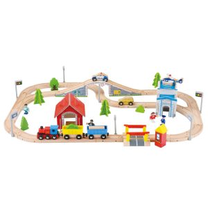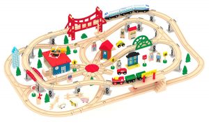 This set is a true value for the money. It includes 100 pieces for a low price over under $40, this is a bargain for anyone looking for a large train set for their child. This set includes various locomotives and train cars made with from quality lotus and beech wood construction that is extremely durable. Included in the bundle are 34 track pieces, 12 cars, 15 people and signs, and 39 trees and houses. It is compatible with other wooden railway systems, and is easily expandable.